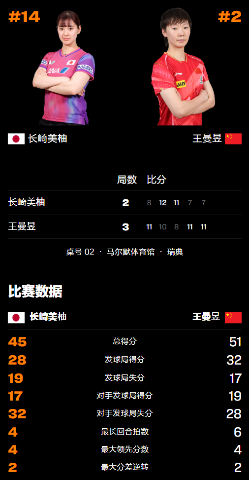 王曼昱是目前世界排名第二的国乒名将,也是世乒赛等大赛的单打冠军得主;长崎美柚曾是日本的希望之星,16岁就有突破中国队主力的战绩,一度被许多球迷看好为日本女队的潜在领军人物,然而后来却陷入瓶颈,逐渐被更年轻的木原美悠、张本美和、大藤沙月超越。